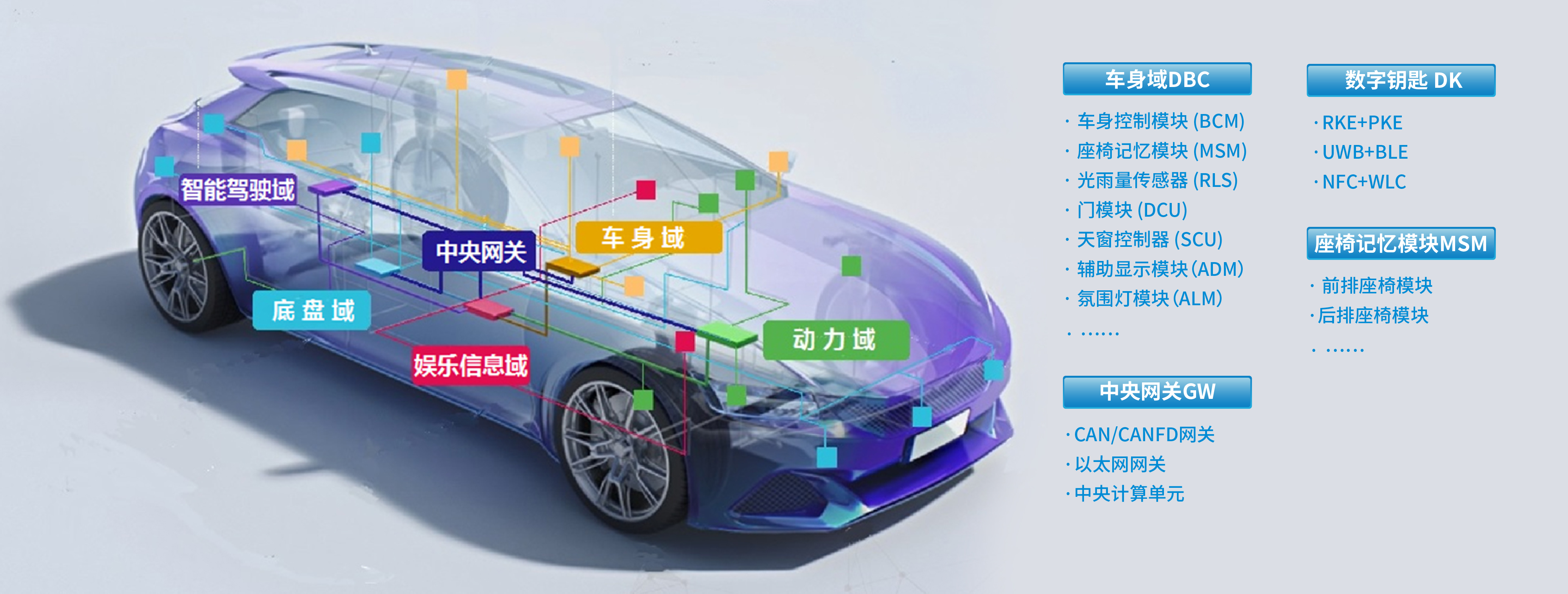 车身电子业务方面,银河集团(galaxy)自2015年布局智能汽车,在软硬件方面均有所积淀,可为客户提供性价比的车身域控制器(BCM/BGM)、网关模块(GW)、数字钥匙(DK)、座椅记忆模块(MSM)等产品。